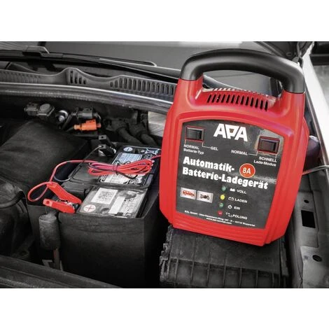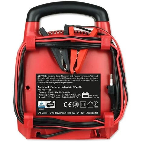 Mit diesem Ladegerät können Sie Ihre leeren Batterien einfach und sicher im Handumdrehen aufladen. Das Ladegerät ist für Blei-Säure-, GEL-, Nass- und AGM-Akkus geeignet. Mit automatischer Umschaltung auf Erhaltungsmodus wenn die Batterie vollständig geladen ist. Features: – Für 12 V AGM-, Gel-, Nass- und wartungsfreie Blei-Säure Batterien geeignet – Schaltet automatisch in den Erhaltungsmodus, wenn die Batterie vollständig geladen ist – LED Anzeige für Ladestatus und Warnung bei Verpolung – Formschönes, kleines Gehäuse mit integriertem Tragegriff – Auswahl des Batterietyps – Mit praktischer Kabelaufwicklung auf der Rückseite – Automatische Sicherung: Bei Funken, Verpolung, Kurzschluss und thermischer Überlastung – 2-stufige Ladekennlinie Technische Daten: – Betriebsspannung: 220…240 V~, 50…60 Hz – Ladestrom: max. 8 A RMS, 5,6 A DC (Schnellladung), 3,75 A RMS, 2,5 A DC (normale Ladung) – Ladespannung: 12 V- – Batteriekapazität: 20…150 Ah – Kabellänge: 1,7 m Netzkabel, 1,4 m Ladekabel – Gewicht: 2,24 kg – Maße (BxHxT): 180x235x105 mm Lieferumfang: – Ladegerät – Bedienungsanleitung