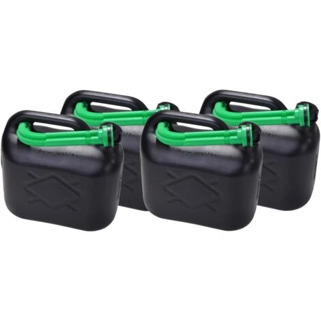 4x Benzinkanister aus Kunststoff mit Ausgussstutzen, Schraubverschluss und stabilem Tragegriff. Das Zweikanalsystem ermöglicht ein schnelles Entleeren ohne Rückstau.