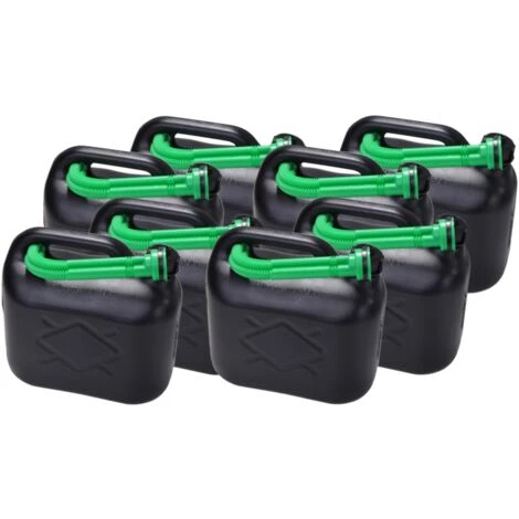 8x Benzinkanister aus Kunststoff mit Ausgussstutzen, Schraubverschluss und stabilem Tragegriff. Das Zweikanalsystem ermöglicht ein schnelles Entleeren ohne Rückstau.