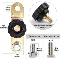 Einfache Installation Schritt 1: Trennen Sie das Massekabel (-) von der Batterie und sichern Sie die Seite Befestigungsflansch mit Gewindebohrung am Schalter. ÉSchritt 2: À Sichern Sie den Schalter mit der mitgelieferten Schraube am Batteriepol (-). Der Befestigungsflansch an der Durchgangsbohrung muss den Batteriepol berühren. Schritt 3: Drehen Sie den grünen Knopf vollständig im Uhrzeigersinn, um die Stromversorgung herzustellen. Schritt 4: Um die Stromversorgung zu trennen, drehen Sie den Knopf 1/4 Umdrehung im Uhrzeigersinn gegen den Uhrzeigersinn. Abnehmbarer Anti-Diebstahl-Knopf. Halten Sie die Verbindungen sauber und fest, um eine optimale Leistung zu gewährleisten.