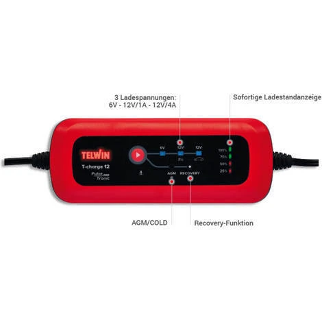 Die „T-Charge“ Serie von Telwin besteht aus kompakten, einfach anzuwendenden und multifunktionellen Batterieladegeräten und Erhaltungsladegeräten. Einsetzbar mit 6V oder 12V Batterien. Die elektronische Steuerung der Ladeprozesse ermöglicht dabei eine Vielzahl an nützlichen Funktionen. So unterstützt das T-Charge 12 das automatische Aufladen und Erhaltungsladen mit PulseTronic bei allen Batterietypen, einschließlich EFB. Darüber hinaus wird durch die COLD-Funktion das behutsame Laden selbst bei niedrigsten Temperaturen gewährleistet. Und mit der RECOVERY-Funktion wird ein Impulsverfahren angewendet, durch welches sich die Sulfate von den Bleiplatten lösen. Die ursprüngliche Batteriekapazität wird somit wiederhergestellt. Die Kombination dieser Technologien verlängert die Lebensdauer der Batterie erheblich.