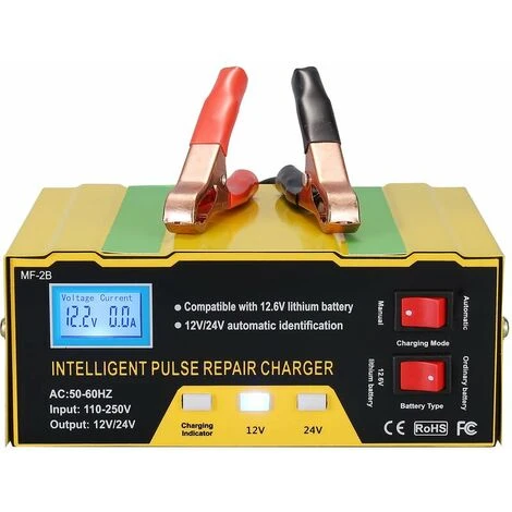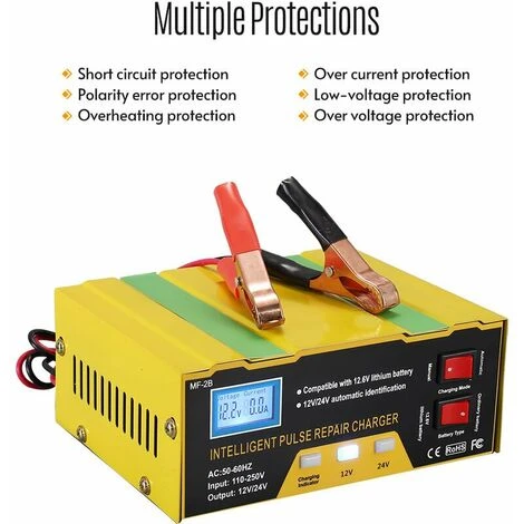 Merkmale: Sicherheitsdesign: Mehrere Schutzfunktionen umfassen Kurzschlussschutz, Schutz vor falscher Polarität, Übertemperaturschutz, Überstromschutz, Niederspannungsschutz und Schutz vor Überspannungen, was eine sichere Verwendung bietet. 5 Ladestufen: Leerlaufmodus bei Wackelkontakt oder Batteriewechsel während des Ladevorgangs; Konstantstromladung zum Schutz der Batterie; Laden mit konstanter Spannung, um ein Überladen zu verhindern; schwimmende Ladung; und Schwachstromversorgung / Vollladung. Breite Anwendungen: Es ist kompatibel mit 12,6-V-Lithiumbatterien oder 12-V-/24-V-Blei-Säure-Batterien, Wasserbatterien, wartungsfreien Batterien, Trockenbatterien, Gelbatterien, Solarbatterien usw. Es kann zum Aufladen von Rollern, Motorrädern, Autos, Kleinlastern und mehr verwendet werden. Zuverlässige Qualität: Es besteht aus reinem Kupfertransformator, Aluminiumwärmeableitung und hochwertigem Clip, der eine stabile und hervorragende Leistung sowie eine lange Lebensdauer gewährleistet. Einfache Bedienung: Es ist für eine einfache Bedienung ausgelegt, eine Taste zum Umschalten des automatischen / manuellen Modus. Zusätzlich zeigen Spannung und Strom auf der Digitalanzeige übersichtlich den Ladezustand in Stufen an. Technische Daten: Material: Metall Stecker: EU-Stecker Eingangsspannung: 110–250 V Ausgangsspannung: 12 V/24 V Leistung: 180 W Frequenz: 50–60 Hz Arbeitsstrom: 0–10 A (automatische Anpassung) Spannungserkennung: 12 V Spitze (8–14,5 V) ; 24V Spitze (18-29V) Betriebstemperatur: -30~35℃ Artikelgröße: 175*138*60mm/6.89*5.43*2.36in Artikelgewicht: 700g/24.69oz Verpackungsgröße: 200*150*80mm / 7.87*5.90* 3,15 Zoll Hinweis: Nur Ladegerät, anderes Zubehör ist nicht im Lieferumfang enthalten. Aufgrund der manuellen Messung kann es zu Abweichungen kommen. Aufgrund der Beleuchtung kann der Artikel auf dem Foto und das Materialobjekt farblich leicht abweichen, bitte in Form von Sachleistungen. Die Ladezeit hängt von der Akkukapazität ab. Bitte blockieren Sie nicht den Lüfter und verwenden Sie das Ladegerät nicht bei ausgeschaltetem Lüfter. Bitte schützen Sie das Ladegerät vor Regen oder Wasser, um Schäden zu vermeiden. Packliste: 1 * Ladegerät 1 * Benutzerhandbuch (Englisch)