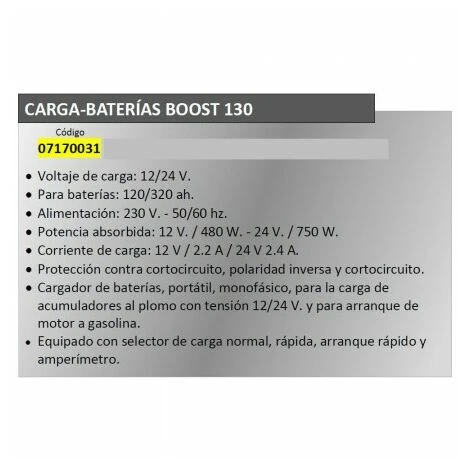 – Cargador de baterías, portátil, monofásico, para la carga de acumuladores al plomo con tensión 12/24 V. y para arranque de motor a gasolina.